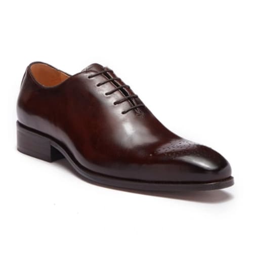A timeless lace-up oxford defined by a brogue medallion and square toe, offering versatility for formal or semi-formal wear.